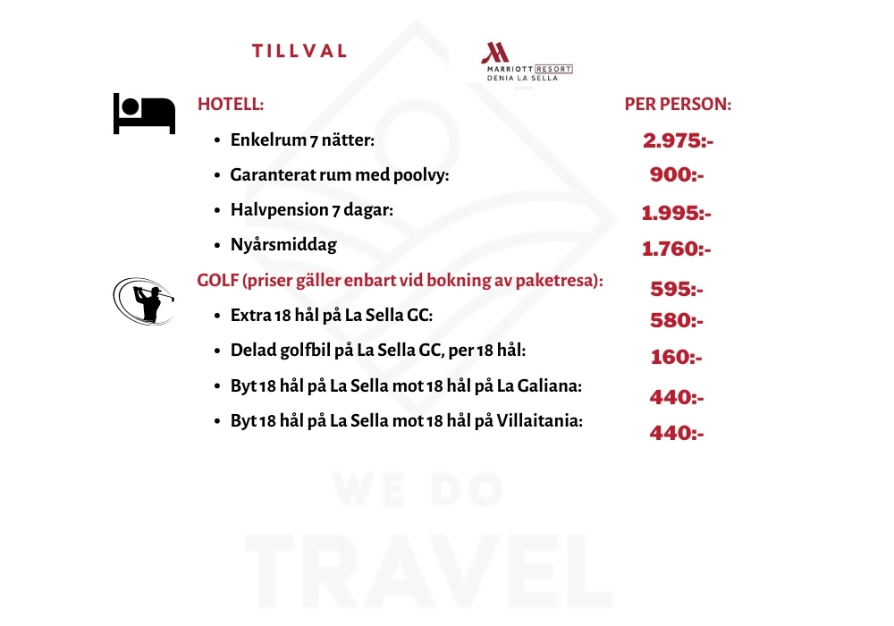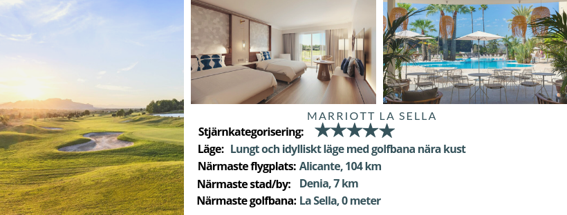 Välkommen till en oförglömlig golfsemester på Marriott La Sella Golf Resort & Spa – din destination för lyx, avkoppling och golfglädje i idylliska norra Costa Blanca. Denna nyligen renoverade femstjärniga oas erbjuder mer än bara en vistelse; den erbjuder en upplevelse. Med 27 spektakulära golfhål designade av den legendariske José María Olazábal direkt utanför dörren, är La Sella ett paradis för golfentusiaster av alla nivåer. Du tar dig enkelt med vår "hyrbil utan krångel"-service direkt från Alicante flygplats till hotellet. TIll härliga kustorten Denia har ni sedan tio minuters färd. Marriott La Sella är inte bara en getaway; det är en resa till det extraordinära, där varje detalj är noga uttänkt för att ge dig den ultimata golfsemestern.