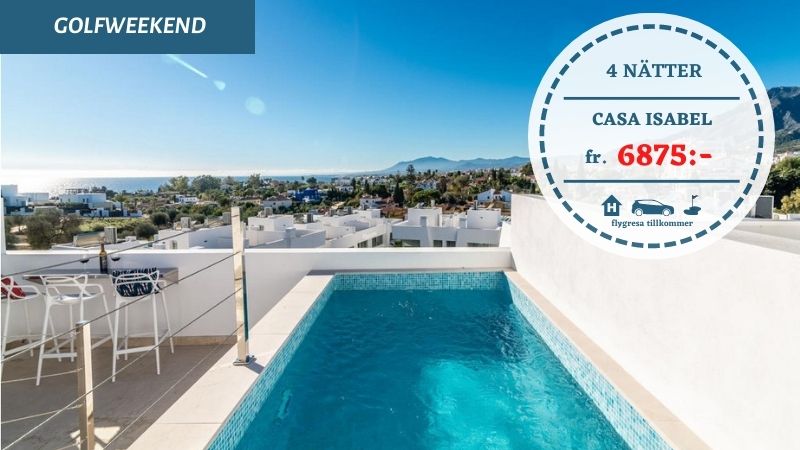 Strax väster om Marbellas gamla kvarter, på promenadavstånd till stränder och ett par minuters bilresa till Rio Reals klubbhus ligger lyxiga Casa Isabel. Ett elegant, välproportionerligt och ljust radhus, inrett på hemtrevlig vis och med privat avskalningspool på terrassen varifrån man blickar ut över Medelhavet. Ett superbt hem för sex till åtta gäster som vill bo bra, ha kul och umgås mellan golfgolfrundor och nöjen på Solkusten.